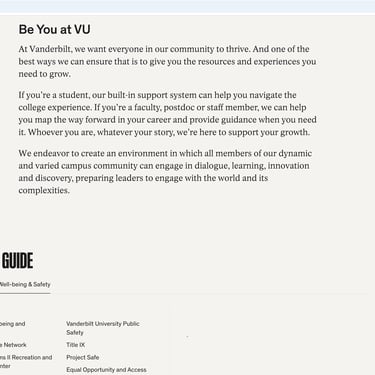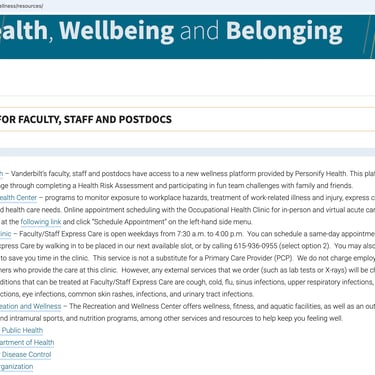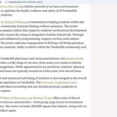 So, we are left to dig into the section on Health and Safety section under Campus Life. In some ways it is super cool that they link those two – Health and Safety and Physical and Mental Health – Vandy says that their Campus Safety does “VandyRide, a complimentary, campuswide shuttle service, and VandySafe, a free app that connects students to the VUPD via their cellphones.” And if you are not safe you can’t be well. So I see that connection. But it still feels forced to me. And I still understand the logic.