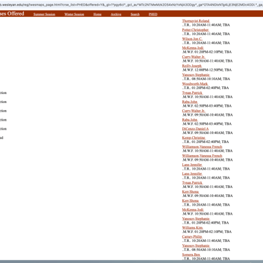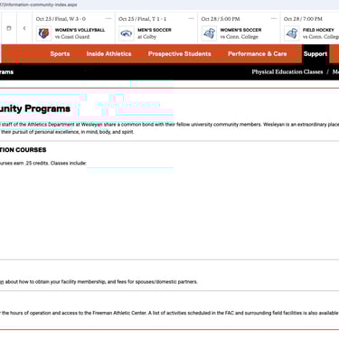 Here is where it gets really weird, they have a robust PE program. It even has this great statement: The Department of Physical Education and Athletics provides the Wesleyan University community with a spectrum of activities that will be of benefit in developing healthy, energetic, and well-balanced lives. The objective is to meet the needs of students and to engage other campus constituencies in physical activity. But on the Athletics website it is called Wes Community Programs. What is going on here? Where are their student fitness programs?