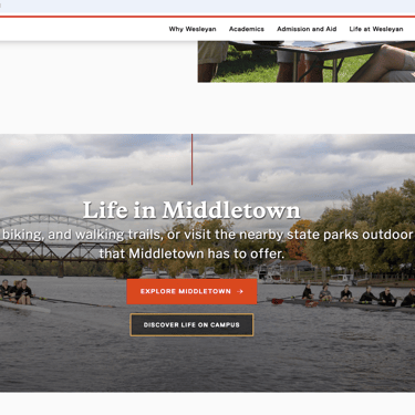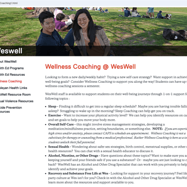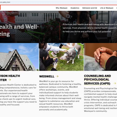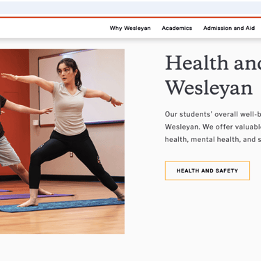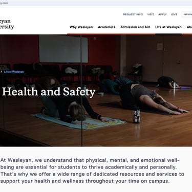 At Wesleyan the highest-level website is Health and Safety. Again I ask, who started this trend of linking these two on websites? Yes, I understand you can’t be healthy if you’re not safe, but the linking of these two just seems odd to me and it has definitely become a trend. One I hope stops at some point. But I don’t have a better option yet. Actually, I do, just have a separate Safety page. It’s important enough for its own title, it really is.