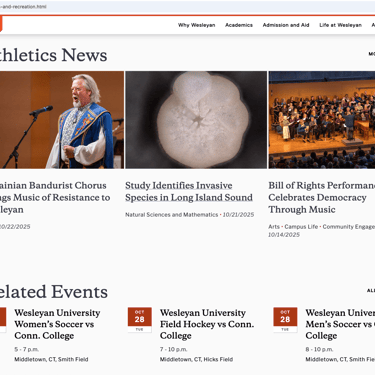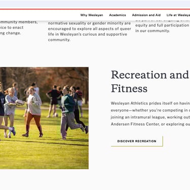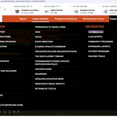 It starts out pretty well with the standard Athletics and Recreation link from the Life at Wesleyan page – though on closer look, the header just says Athletics on this page – and an even deeper look shows that the linked button says Sports and Athletics – so that is three different names for the department on just one web-page. Ouch.